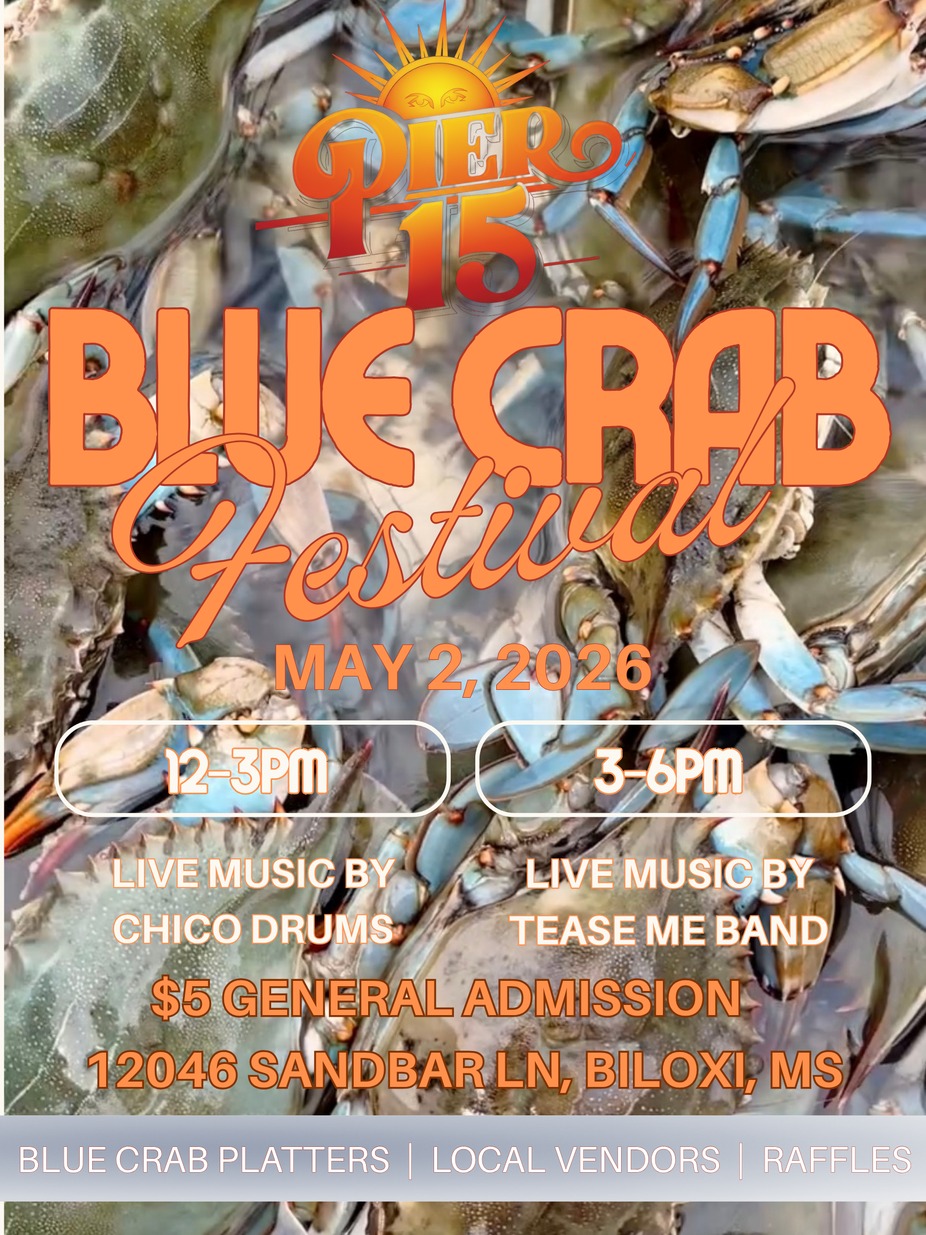 Pier 15โs 2026 Blue Crab Festival hits May 2nd with live music, blue crab boil, full bar, beach volleyball, cornhole, sandbar fun, raffles, local vendors & more!