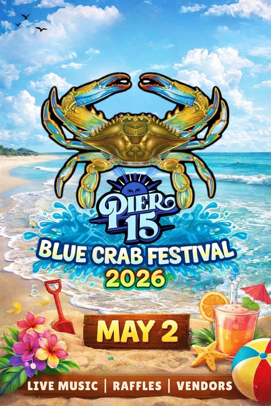 Pier 15โs 2026 Blue Crab Festival hits May 2nd with live music, blue crab boil, full bar, beach volleyball, cornhole, sandbar fun, raffles, local vendors & more!