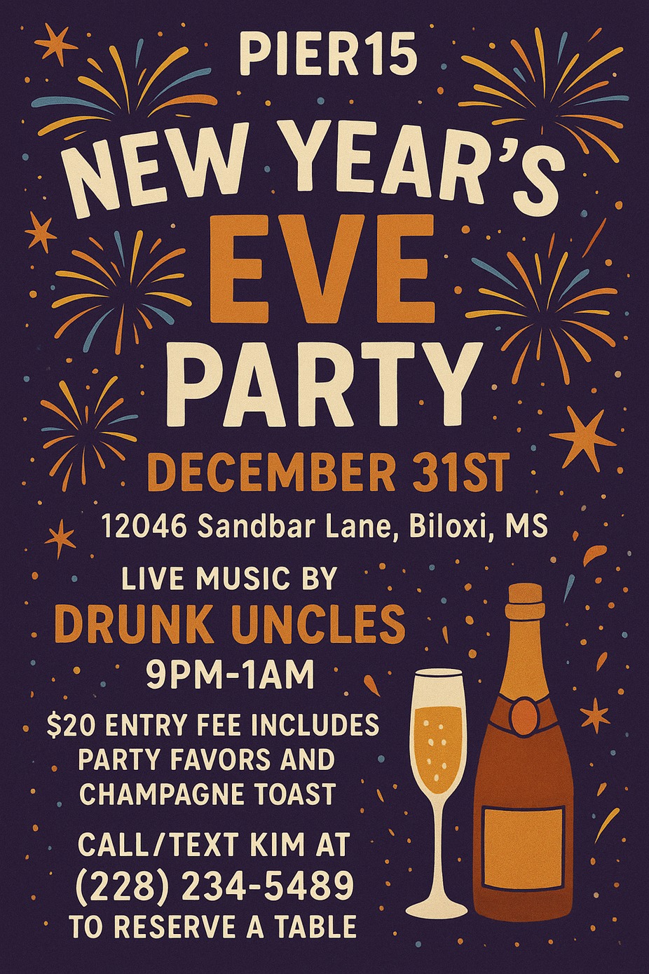 β¨π NYE at Pier15 is THE place to be! πβ¨ Ring in 2026 with live music by Drunk Uncles, party favors, champagne, and the best vibes on the Biloxi River! πΎ π12046 Sandbar Lane β° 9PMβ1AM π² $20 entry Reserve your table now β call/text Kim at (228) 234-5489!